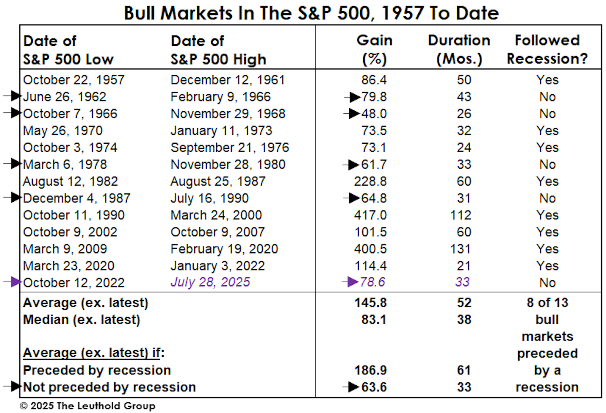 July’s rally brought the S&P 500 bull market gain to 78.6% (since its October 2022 inception)—an impressive accomplishment considering the bull began with the U.S. economy at full employment, and with the bear-market low occurring with some of our long-term valuation measures still in their top quintile. While the sample size is small, an 80% gain has been the limit for bull markets that followed non-recessionary bears. Relative to its “post-recession” counterparts, this particular strain of bull has delivered a much smaller average gain (+63.6% vs. +186.9%) over a shorter average lifespan (33 months vs. 61 months).