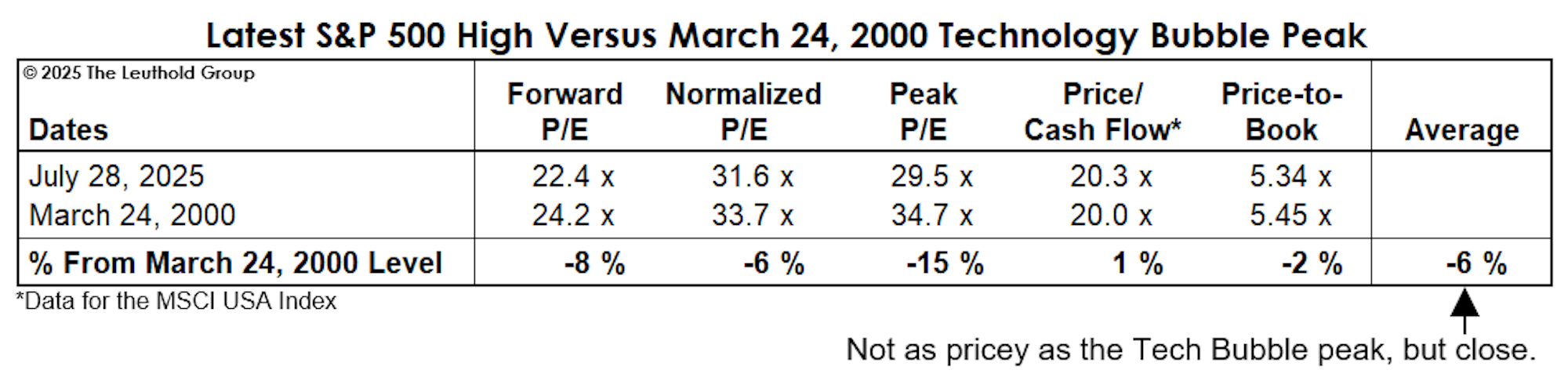 - From a valuation perspective, the recent highs put the S&P 500 in the same zip code as March 2000. By the way, every one of the five valuation measures shown in this table is now 50% or more above levels seen at another historic high—October 9, 2007.